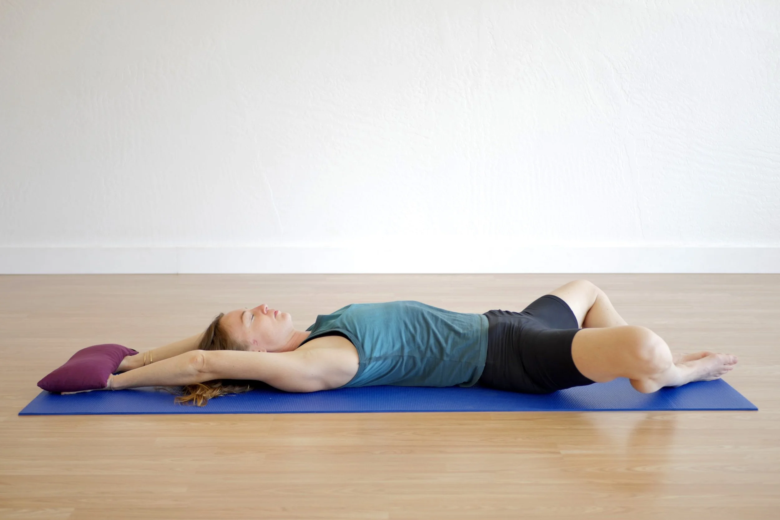 In this reclined variation, the top leg crosses over the bottom leg, drawing it across the body’s midline. This is hip adduction—the action of moving the thigh toward or across the centerline. The hips are also in flexion, since the knees are bent and pulled toward the torso. This shape gently activates the inner thighs and outer hips, and can be a great way to bring awareness to adduction, a movement pattern that’s often underused in daily life but essential for stability and healthy hip mechanics.